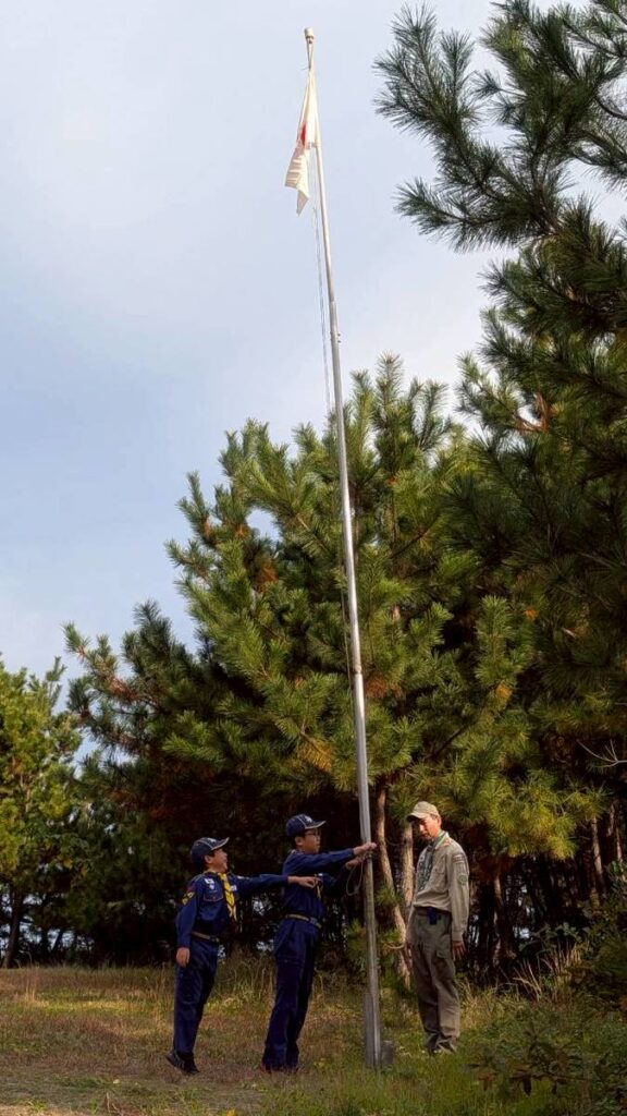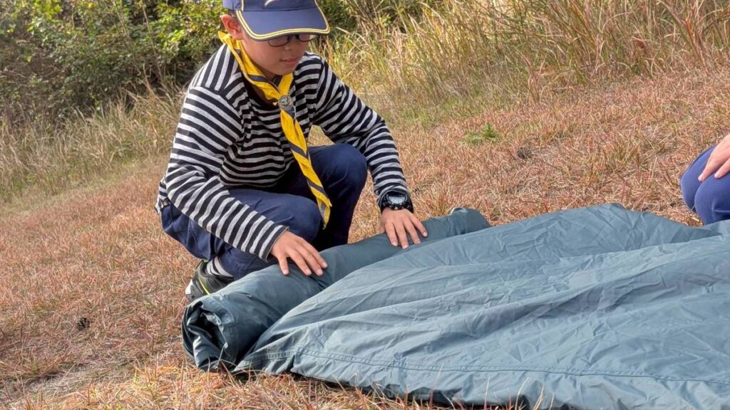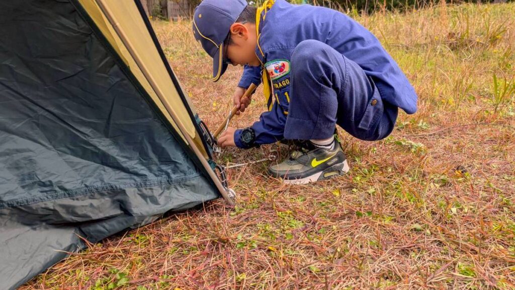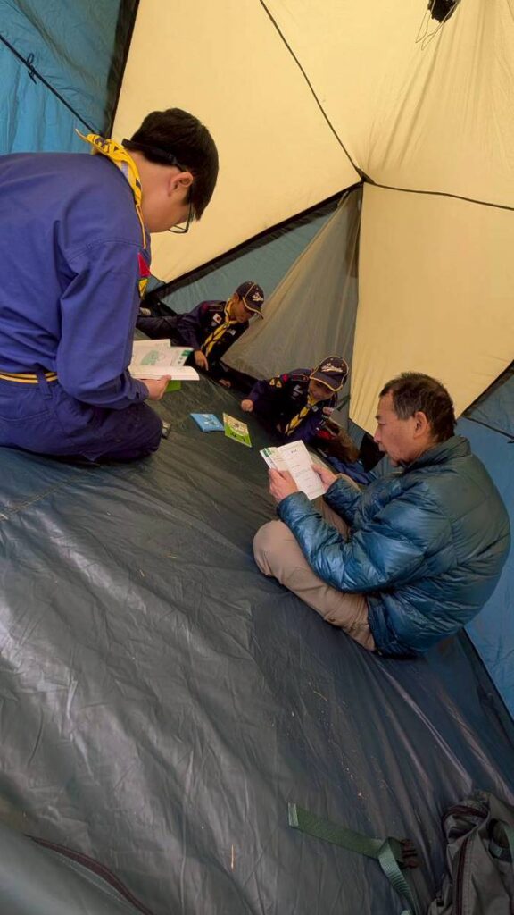 貼り終わったらテントの中でカブブックのチェックを行いました。